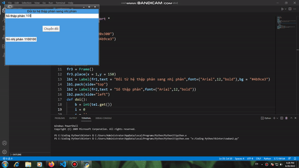 doi() là 1 chương trình con mình viết ra với mục đích đổi số mà người dùng nhập từ bàn phím sang hệ nhị phân. Chương trình con này chính là 1 bài toán lập trình cơ bản, thuật toán không quá phức tạp. Mình sẽ nói về thuật toán của chương trình này trong 1 bài viết khác. Bây giờ, mình sẽ giải thích về te1.get(). Như các bạn đã biết te1 chính là một Entry. Phương thức get() có tác dụng lấy giá trị mà người dùng nhập vào. Tuy nhiên, giá trị này sẽ có kiểu String. Bởi vậy, để có thể thực hiện các phép toán. Mình đã thực hiện ép giá trị này sang kiểu int và gán nó cho 1 biến đó là b. Biến s đóng vai trò là chuỗi lưu lại các số dư. Câu lệnh lb3.config(text = s[::-1]) để hiển thị giá trị s theo chiều ngược lại, hay chính là số nhị phân cần tìm. Lí do phải viết theo chiều ngược lại đó là khi chuyển số thập phân sang nhị phân, bạn phải chia số này liên tục cho 2 đến khi nó bằng 0, và tổng hợp các số dư từ dưới lên chính là số nhị phân cần tìm. Để hiểu rõ hơn, bạn có thể đọc bài viết sau: Cách đổi từ hệ thập phân sang nhị phân